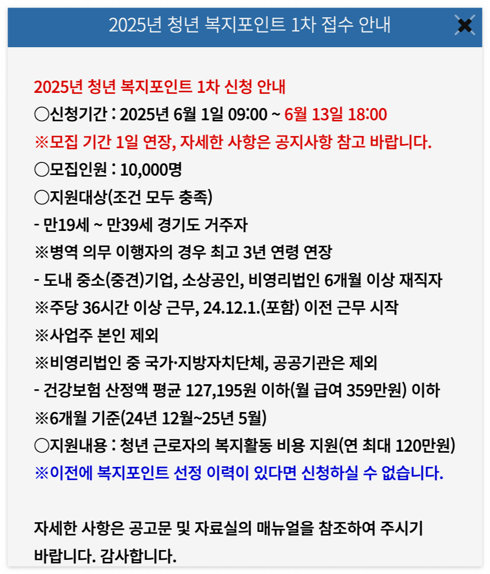 2025년 상반기 청년 복지포인트는 6월 13일 금요일 18시 마감!